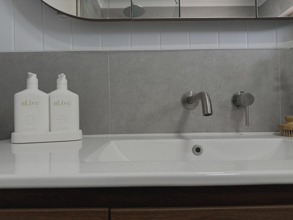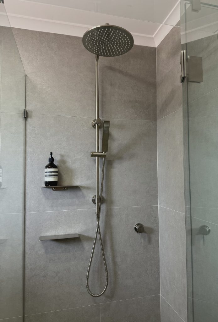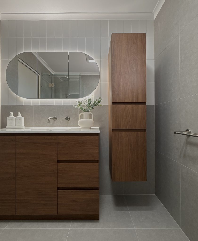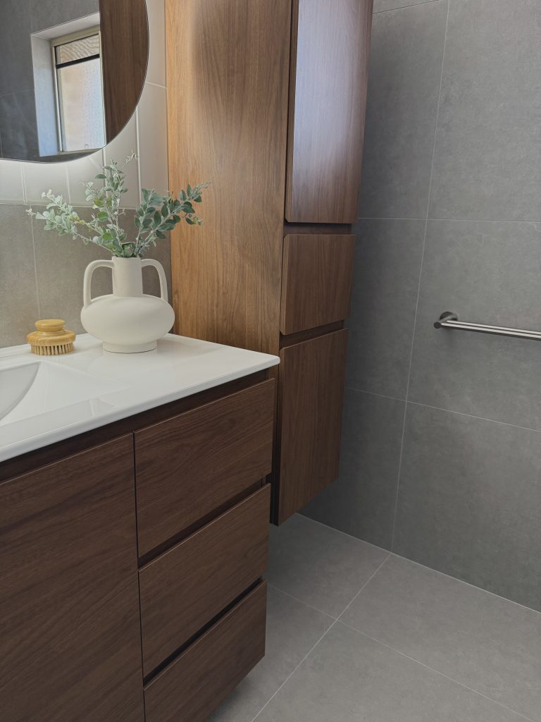 Our client Georgia came to us looking to renovate her bathroom as one of her first renovation projects. Status Flow worked with Georgia to find inspiration that suited her vision of a simple, clean aesthetic and sourced products and tiles to suit. Our client was also after a practical bathroom, seeking the best layout for a small space and improved storage solutions. With beautiful grey tiles, a no fuss but modern aesthetic was achieved, a practical layout and a tall boy, vanity and large shaving cabinet for plenty of storage – Georgia’s vision came to life.